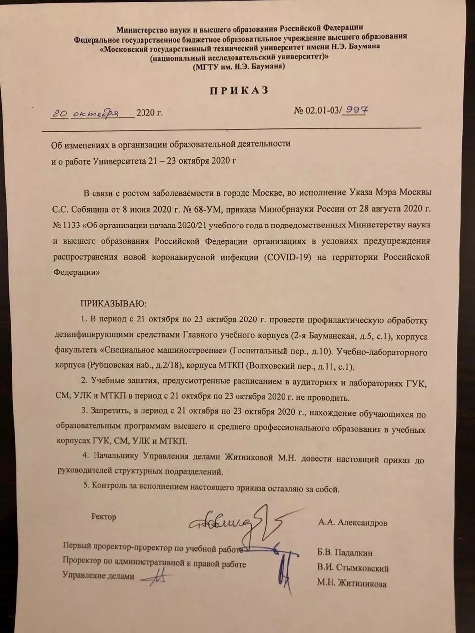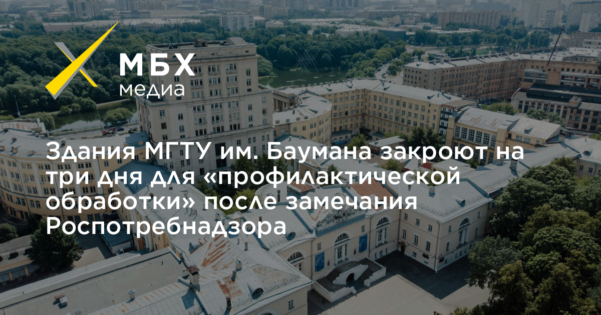 Здания МГТУ им. Баумана закроют для дезинфекции и санитарной обработки после замечания Роспотребнадзора о несоблюдении антиковидных мер. Это следует из приказа ректора университета Анатолия Александрова, документ есть в распоряжении «МБХ медиа».