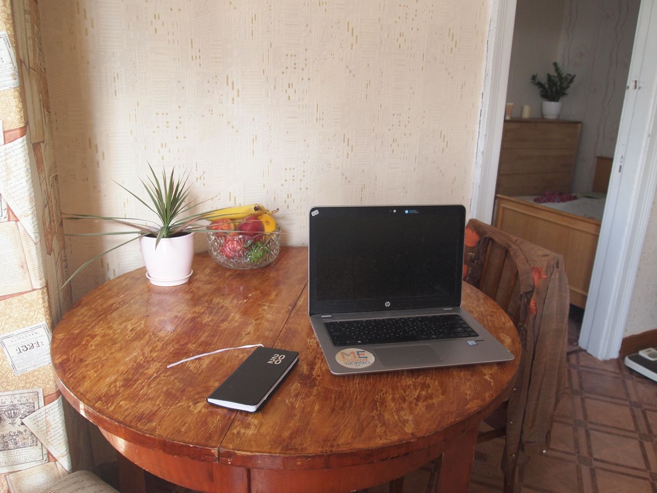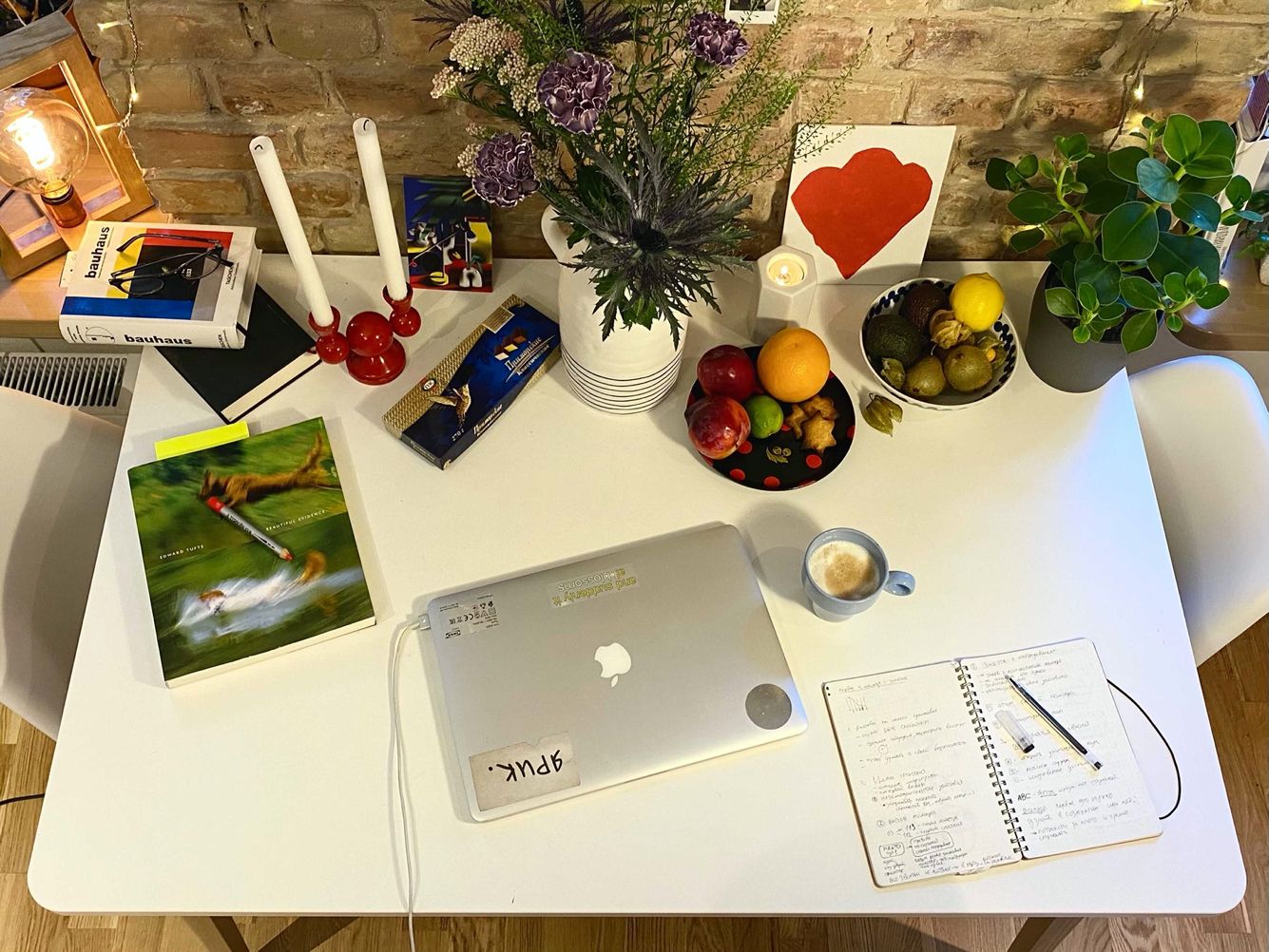 Мой любимый предмет на столе — это деревянная тарелка с хохломской росписью (дизайн Анны Кулачек). Вообще это прежде всего обеденный стол, но работаю и учусь я почему-то только здесь.