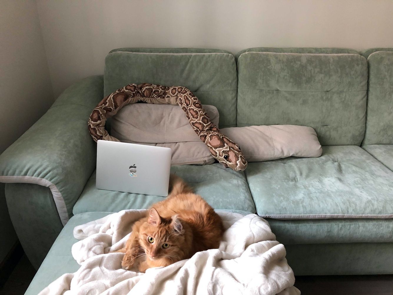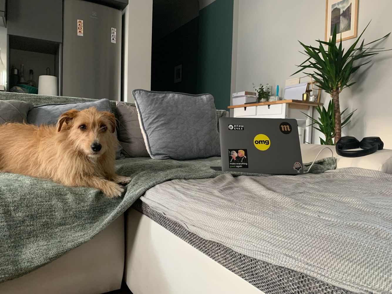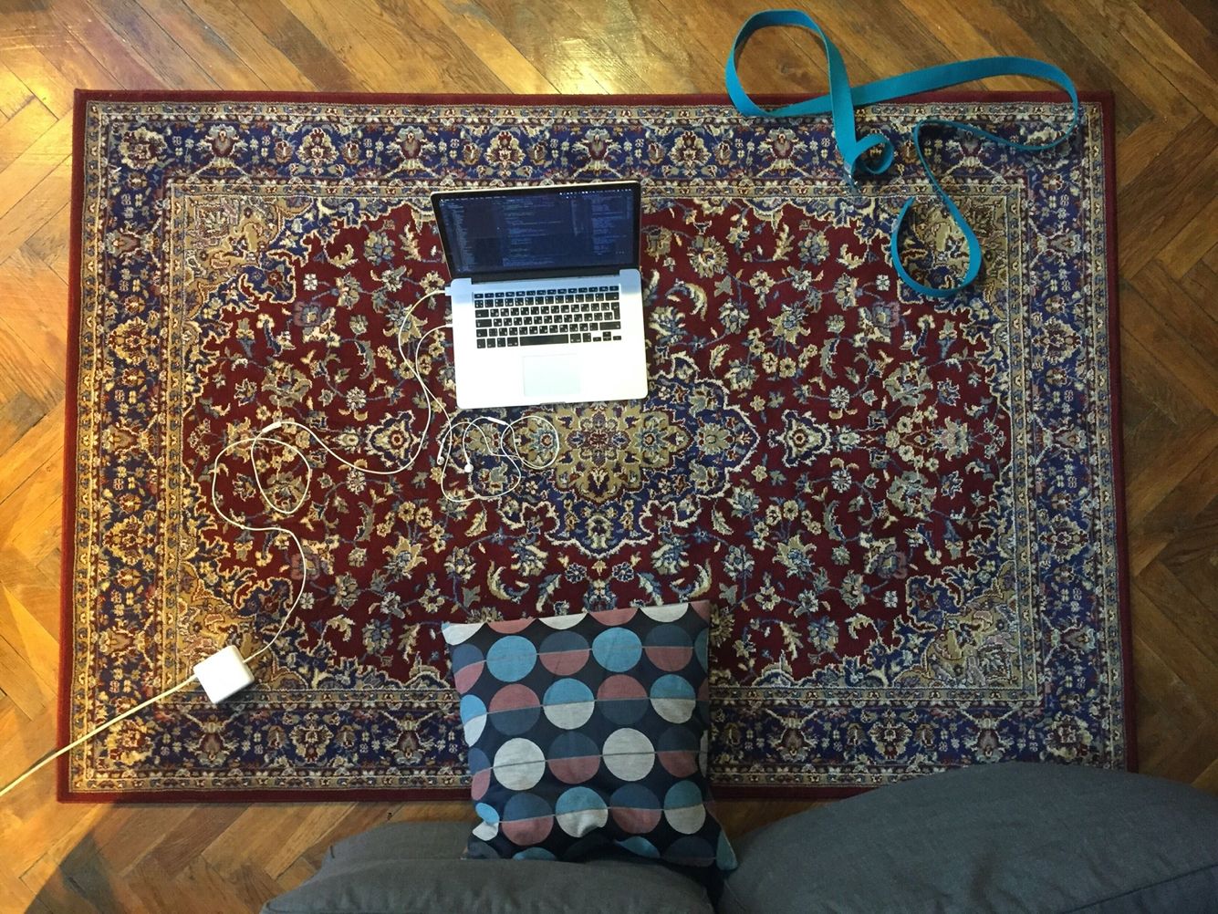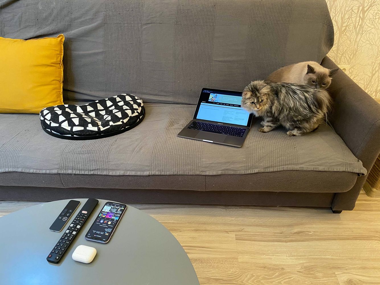 На нем происходит работа. За диваном — розетка, от которой тянется зарядный кабель, потому что макбуки, увы, уже неспособны проработать много часов без подзарядки.