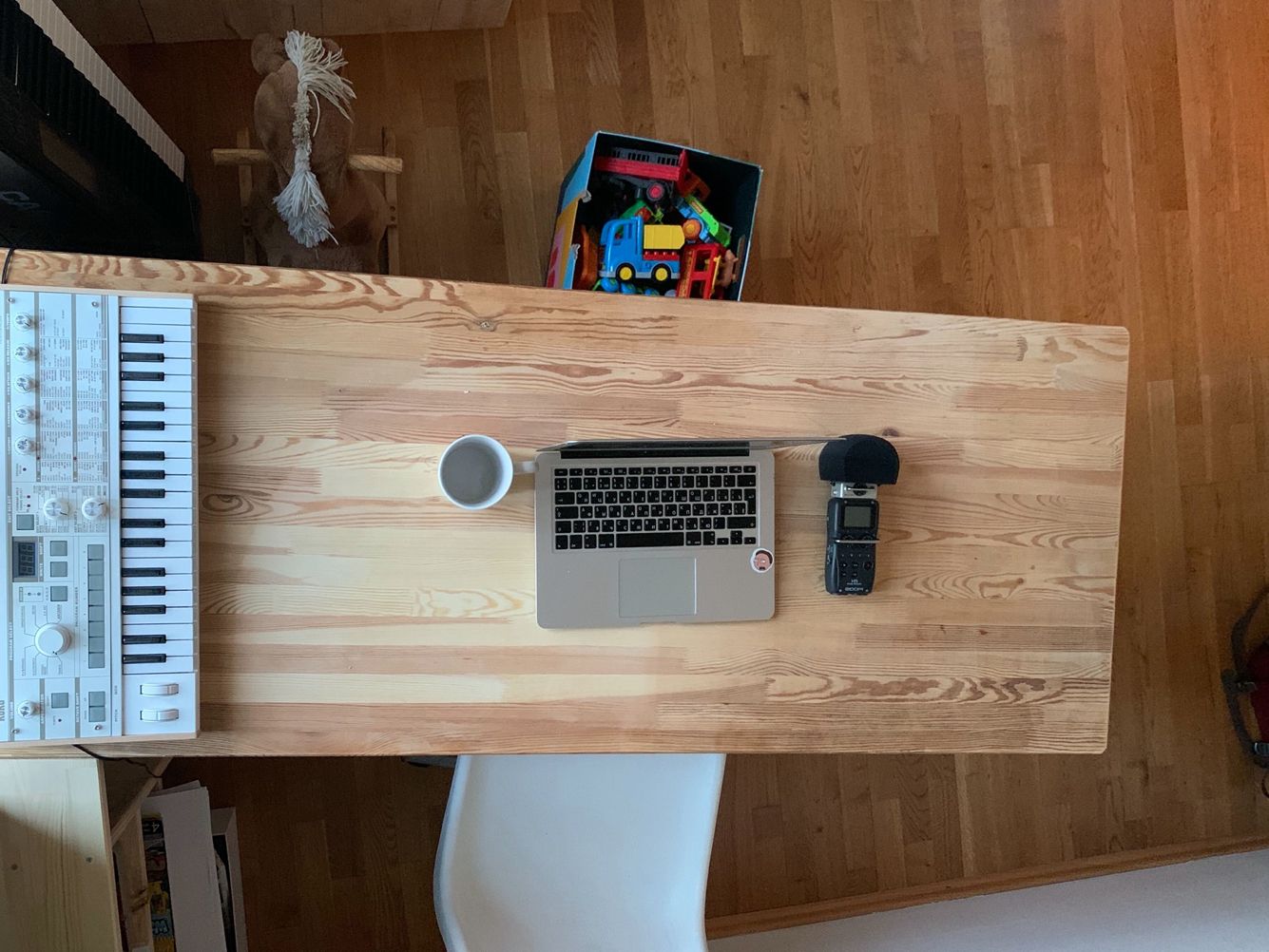 Рядом валяются укулеле (брал детям, чтоб осваивали песни The Beatles и Билли Айлиш, — но играю пока в основном сам) и миди-клавиатура (решил освоить сам — но что-то пока руки не доходят, пылится в основном).