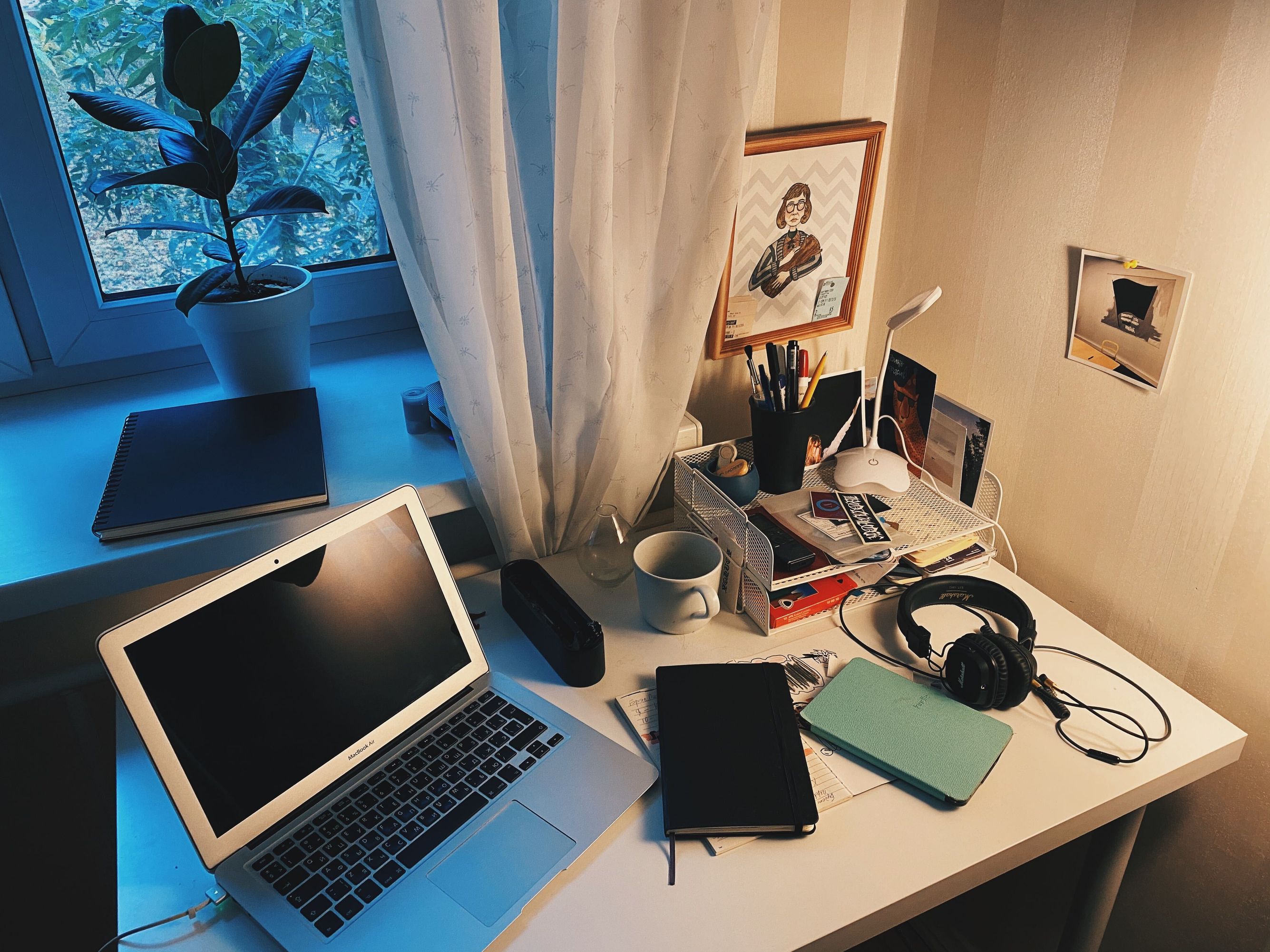 Вообще-то это обеденный стол. И стоит он в гостиной. Письменный у меня тоже есть, но он в другой комнате, и я за ним почти не сижу в дневное время — в гостиной у меня три окна и больше света.