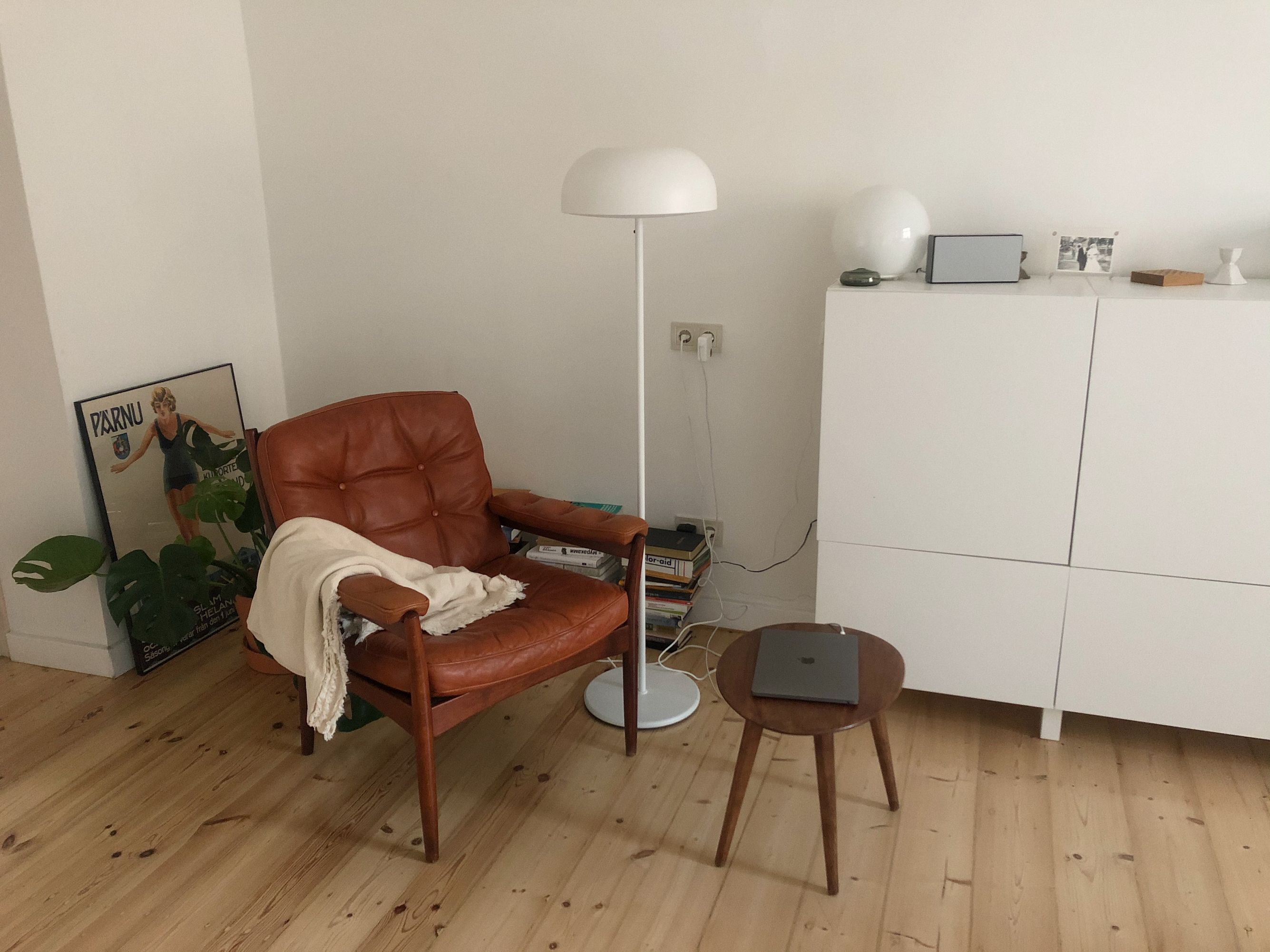 У меня дома есть только обеденный стол, и я редко за ним работаю, в основном сижу тут. Кресло из любимого рижского магазина винтажной мебели — Mēbeļu Bode.