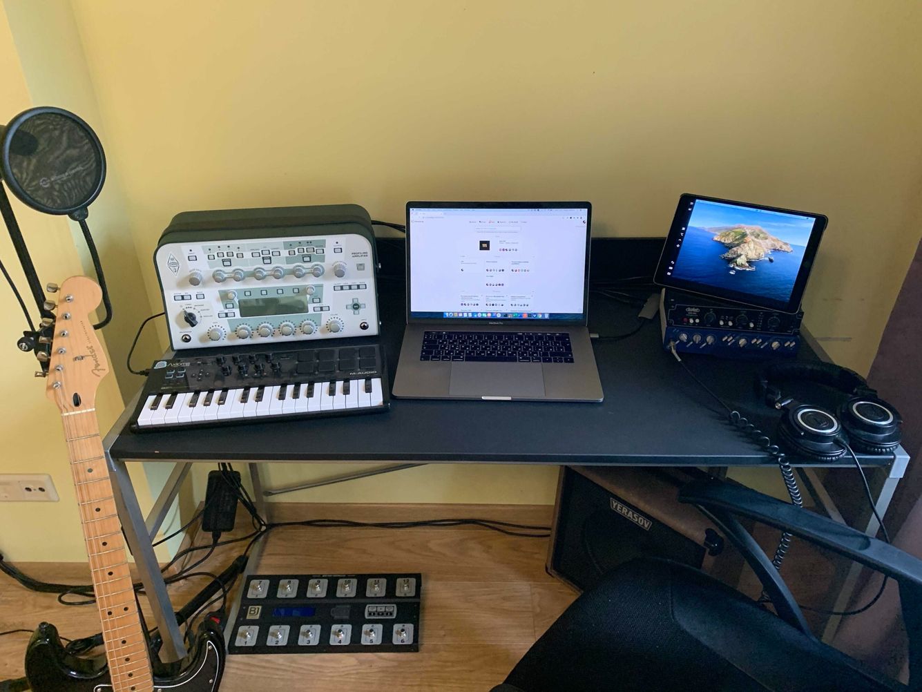 Все это музыкальное оборудование заменяет мне мою студию, которая была в Москве. Через процессор я записываю гитары, а контроллер (в основном) нужен, чтобы набивать биты.