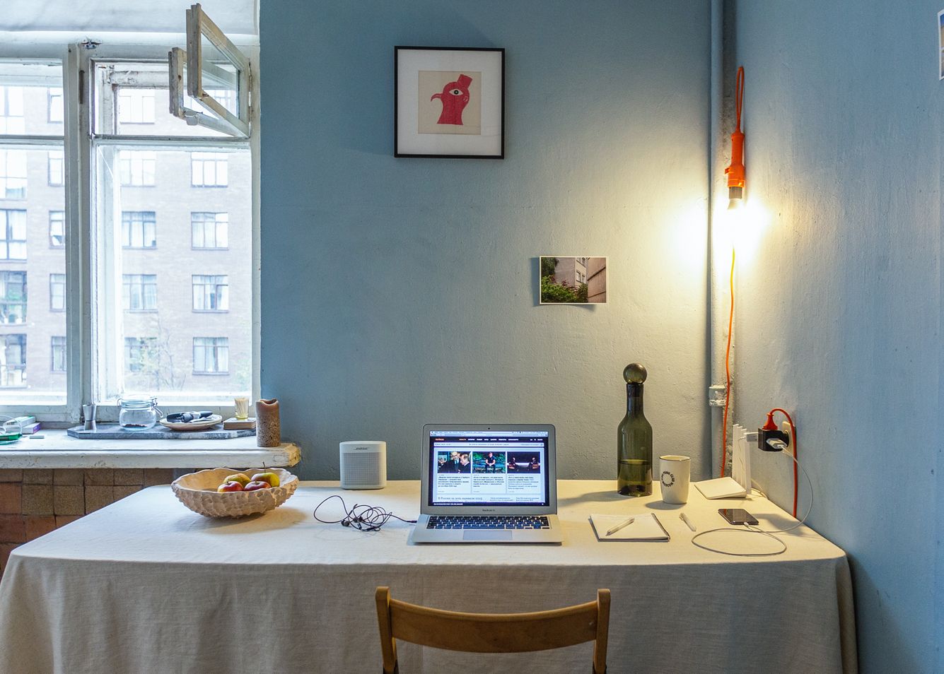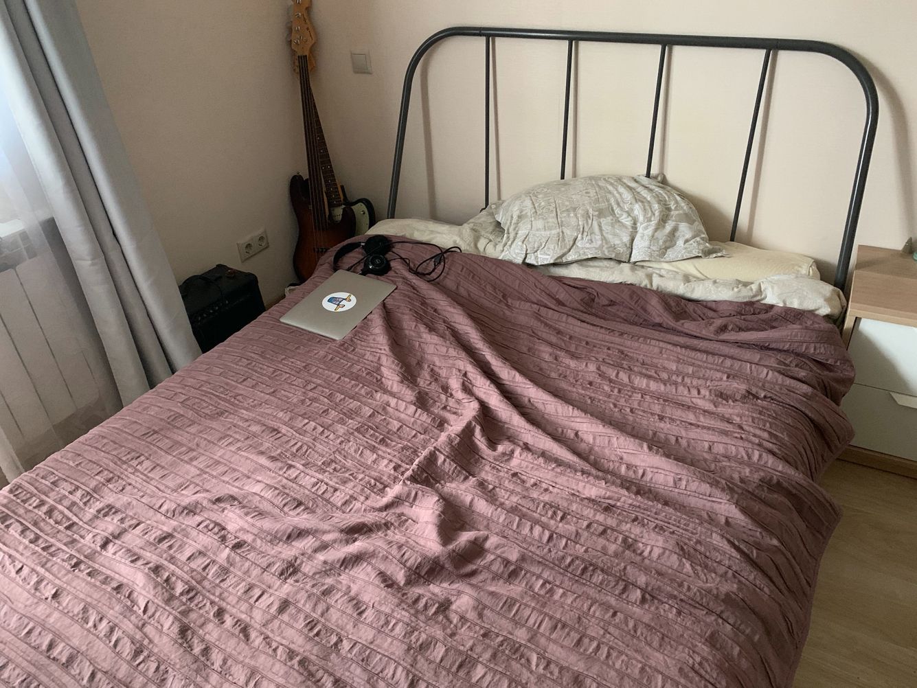 Квартира у меня небольшая — своего письменного стола нет, поэтому работать приходится из застеленной кровати. Зато, если заскучаешь, всегда можно взять гитару или бас, которые стоят рядом, и поиграть!