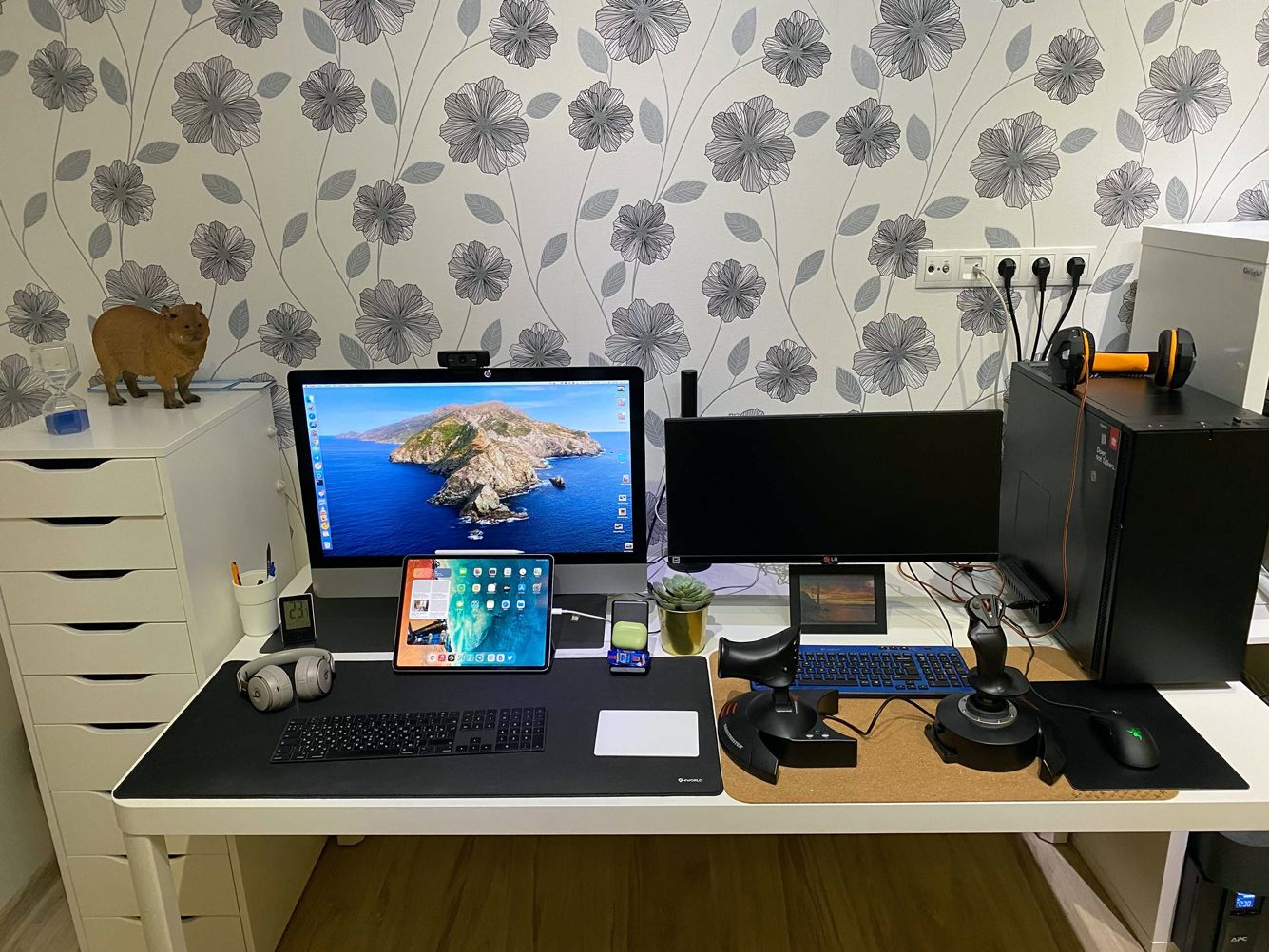Это компьютер для игр. Как можно заметить, в последнее время он используется для авиасимуляторов. Системный блок на столе — это ужасно, но зато так к нему удобно подключать шлем виртуальной реальности, чтобы играть возле стола.