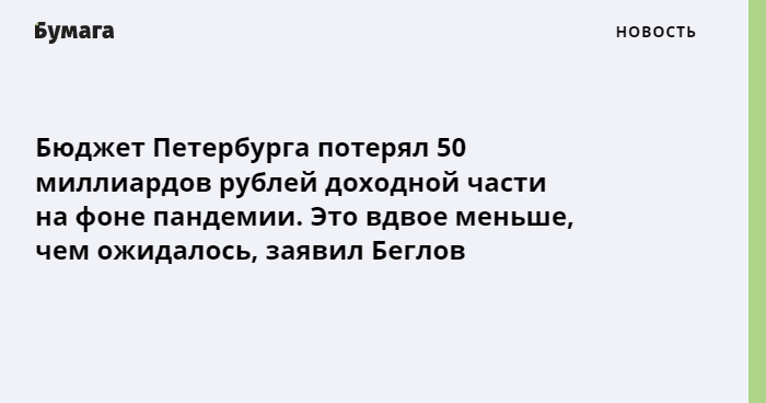 Доходы города оказались на 50 миллиардов рублей меньше в сравнении с первоначальным вариантом бюджета. Как отметил Беглов, из-за пандемии предполагаемые потери оценивались в 100 миллиардов рублей. «Фактическое падение дохода оказалось не столь драматичным, хоть и проблематичным», — сказал Беглов. В сравнении с аналогичным периодом 2019 года падение доходов составило 0,2 %.