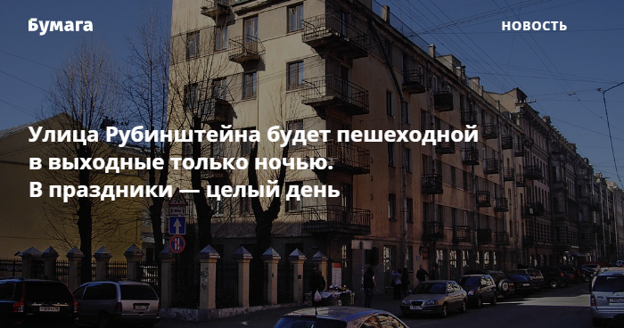 Рубинштейна будет пешеходной в выходные лишь ночью: с 22:00 пятницы до 8:00 субботы и с 22:00 субботы до 8:00 воскресенья. При этом в праздничные дни движение автомобилей по улице будет запрещено на 24 часа.