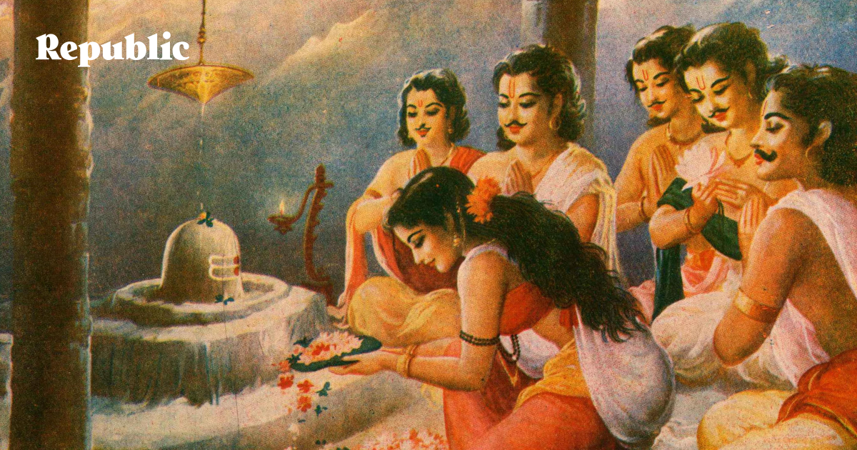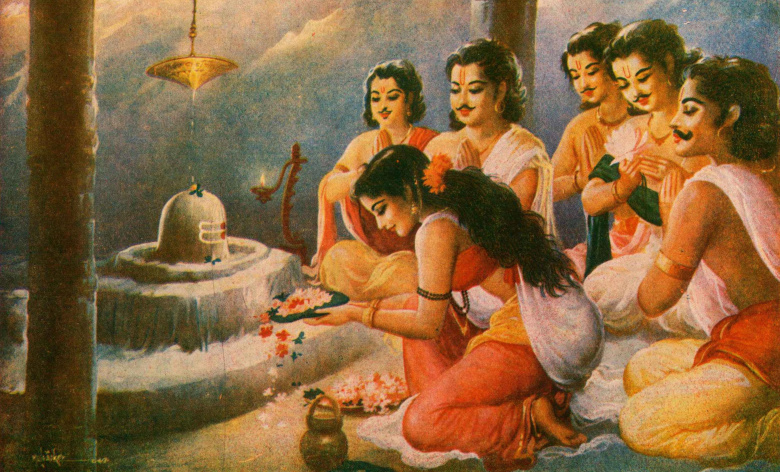 Героиня индийского эпоса “Махабхарата” Драупади и ее пять мужей — богатырей-пандавов. В разных версиях мифа пандавы либо смертельно соперничают друг с другом из-за жены, либо живут все вместе в мире и согласии.