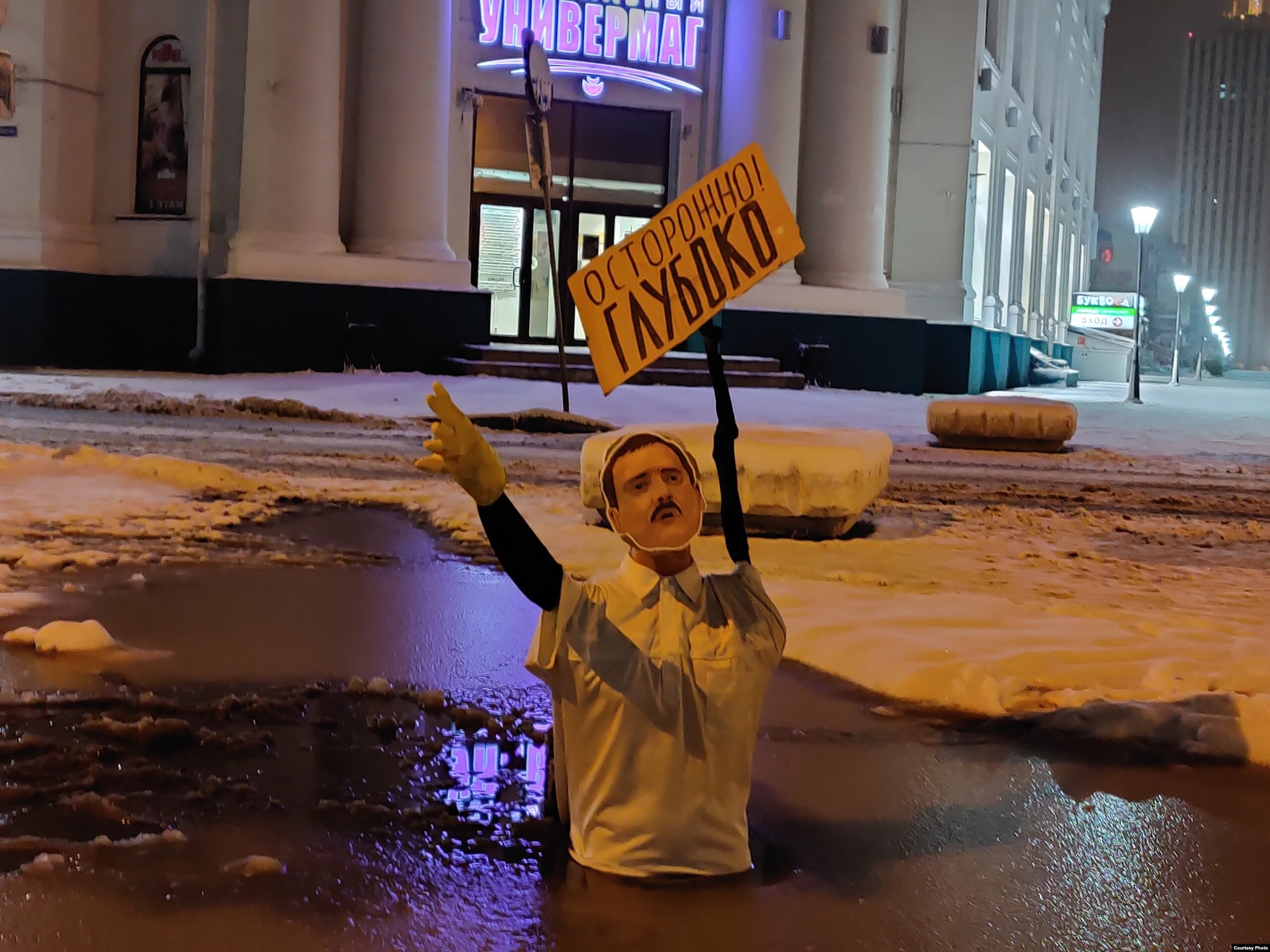 Активисты движения "Всеобщие инициативы человеколюбия" (ВИЧ) установили картонного экс-главу Архангельска Игоря Годзиша в огромной луже на главной пешеходной улице города. Он предупреждает прохожих об опасностях, которые таит в себе лужа, разросшаяся до размеров моря. Об этом Север.Реалии рассказали сами активисты, которые не раскрывают своих имен.