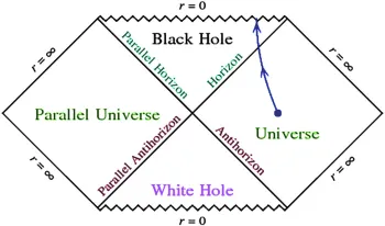 Во-вторых, вклад Роджера Пенроуза в теорию гравитации конечно же не сводится к доказательству этих теорем. Перечислим несколько (возможно, самых ярких) его результатов. Пенроуз сформулировал так называемый «принцип космической цензуры», который утверждает, что за исключением некоторых особенных случаев сингулярности окружены горизонтами событий (то есть находятся внутри черных дыр) и поэтому не влияют на события, происходящие во внешнем пространстве. Он предложил так называемый процесс Пенроуза. Этот процесс связан с существованием вблизи вращающейся черной дыры (внутри ее эргосферы) орбит с полной отрицательной энергией. Если прилетающая издалека частица распадается на две части, одна из которых начинает двигаться по такой орбите, а вторая улетает от черной дыры, то улетающий продукт распада обладает большей энергией, чем прилетевшая частица. Таким образом, можно попытаться использовать энергию вращения черной дыры. Кроме своего принципиального значения, процесс Пенроуза родственен так называемому процессу Блэндфорда — Знаека, формирующему, как считается, релятивистские выбросы вещества, называемые джетами, которые наблюдаются в центрах многих активных галактик. Кроме этого, процесс Пенроуза имеет отношение к эффекту «сверхизлучения» вращающейся черной дыры, предложенному Я.Б.Зельдовичем и А.А.Старобинским. Этот эффект состоит в том, что вращающаяся черная дыра может рассеивать падающие на нее электромагнитные волны с увеличением их мощности. Анализ Хокингом эффекта «сверхизлучения» привел его к знаменитому предсказанию испарения черных дыр за счет квантовых эффектов. Пенроуз предложил так называемую теорию твисторов, которая нашла свое применение не только в ОТО, но и в других теориях поля. Наконец, Пенроуз предложил «диаграммы Пенроуза», позволяющие наглядно представить то или иное пространство-время. По сути, для специалистов в области теории гравитации их роль так же велика, как и роль диаграмм Фейнмана для специалистов в области физики частиц. Пример диаграммы Пенроуза, описывающей так называемую вечную невращающуюся черную дыру, или черную дыру Шварцшильда, приведен на рис. 2. Отметим, что на этой диаграмме показана не только черная, но и белая дыра.