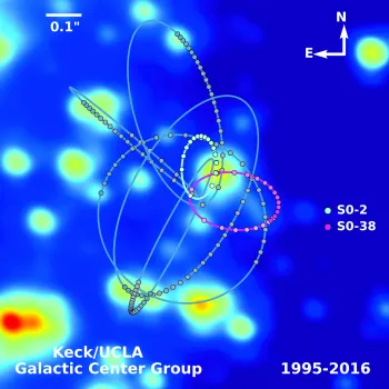 Героем нобелевской истории стала звезда SO-2, у нее самая тесная орбита из ярких звезд S-скопления (есть звезда с более коротким периодом и, возможно, менее яркие звезды с еще более короткими, но SO-2 — самая удобная для наблюдений). Решающие измерения были сделаны в работах Schödel et al. (2002) и Ghez et al. (2003). На рис. 7 показана траектория звезды, измеренная позже двумя группами — Gillessen et al. (2009) на телескопах NNT и VLT (Чили) и Гез на телескопе Кека (Гавайи). На этом рисунке приведены данные 2010 года. С тех пор звезда совершила еще один оборот вокруг черной дыры. Ее орбитальная скорость в перицентре достигает 5000 км/с, она проходит на расстоянии около 17 световых часов от черной дыры — чуть ближе, чем расстояние от нас до «Вояджеров».