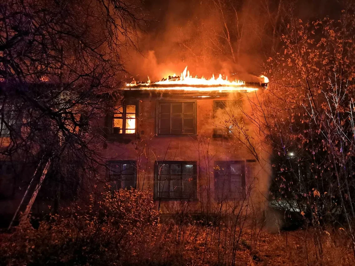 О пожаре стало известно в районе 23:22. Подразделения пожарно-спасательного гарнизона, прибыв на место происшествия, обнаружили сильное возгорание крыши.