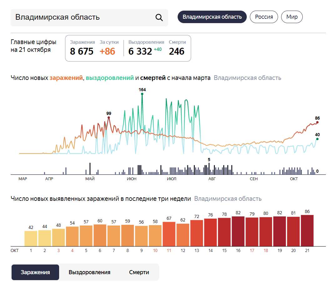 Эпидемиологическая ситуация во Владимирской области продолжает ухудшаться. За последние сутки в регионе выявлено ещё 86 новых пациентов, заражённых COVID-19. Это рекордный суточный прирост за лето и осень 2020 года.