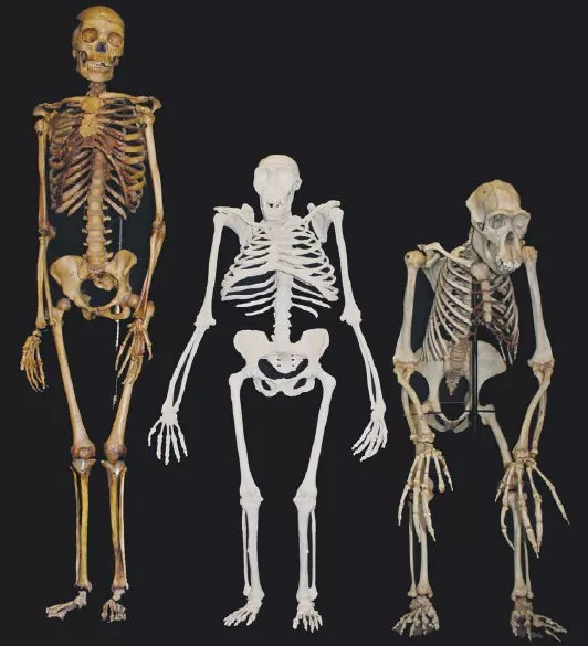 Для сравнения: скелеты (слева направо) современного человека, Australopithecus sediba и современного шимпанзе