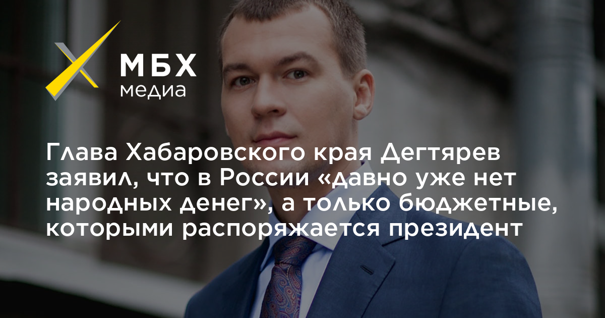 Врио губернатора Хабаровского края Михаил Дегтярев считает, что никаких «народных денег» в России «давно уже нет» — есть бюджетные, и ими распоряжается президент. Об этом он заявил в эфире программы «Утро с губернией» телеканала «Губерния».