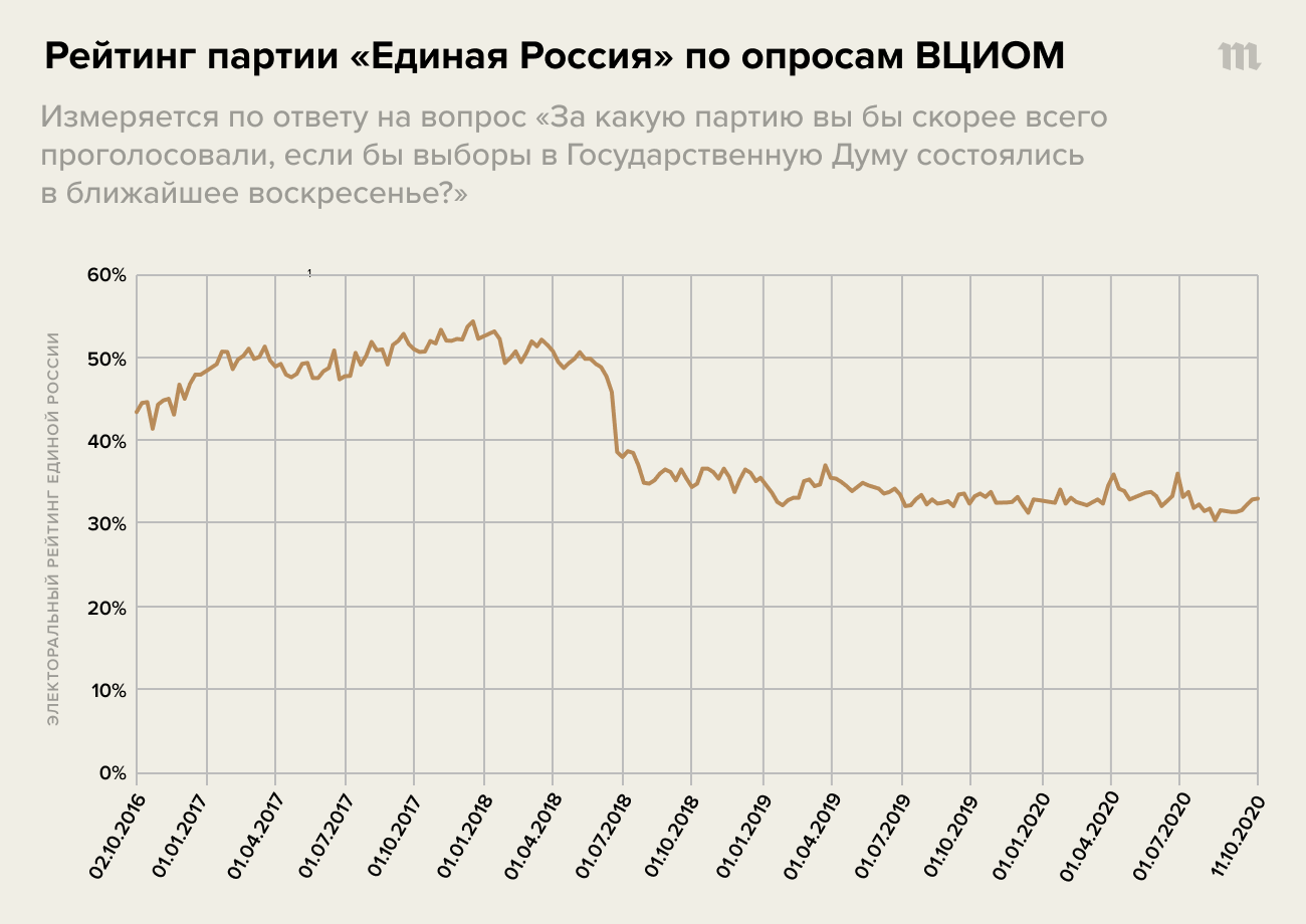 По итогам прошлой думской кампании единороссы получили 343 депутатских кресла из 450. Тогда ЕР, по официальным данным, набрала 54% по партийным спискам (это дало ей 140 мест) и выиграла мандаты в 203 округах из 225. Теперь же в партии власти полагают, что получить столько мест не выйдет «в силу ряда объективных причин, имеющих негативное влияние на политическую повестку в целом». Источник в «Единой России» объяснил, что «объективными причинами» в партии считают повышение пенсионного возраста, одобренное парламентом в июле 2018 года, и «недовольство людей карантинными мерами, которые бьют по экономике, а значит, и по их карману».