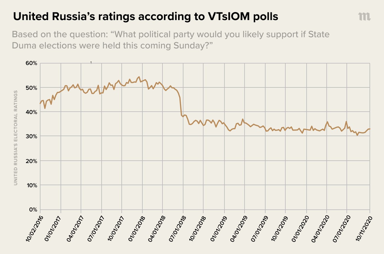 In the last parliamentary elections, according to the official results, United Russia won 343 of the State Duma’s 450 seats, claiming 54 percent of all party-list races (netting 140 seats) and 203 of all 225 single-mandate elections. Party officials now believe that winning so many seats is unfeasible “for multiple objective reasons that negatively impact [United Russia’s] political agenda as a whole.” A source inside United Russia told Meduza that the “objective reasons” to which the report alludes are the government’s decision to raise Russia’s retirement ages (approved by the parliament in July 2018) and “the public’s dissatisfaction with [coronavirus] quarantine measures, which have hit the economy and therefore hit people’s wallets.”