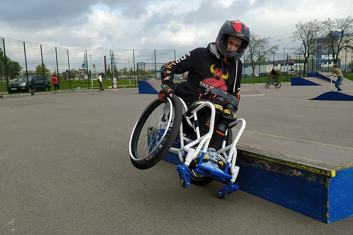 Никаких аналогов этой коляски у нас до этого не было — я занимался на повседневной. Поначалу можно обойтись и без экстремальной коляски, потому что нет необходимости прыгать с высоких уступов. Но для более серьезных элементов она уже нужна.