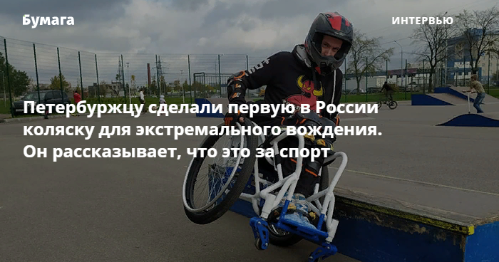 До этого никто в России особо не занимался экстремальным вождением коляски. [Поэтому таких моделей коляски в стране не делали]. Мы, по сути, первооткрыватели движения. Даже культура скейт-парков в Россию пришла не так давно, что уж говорить о колясочниках.