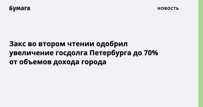 Депутаты Закса Петербурга во втором чтении одобрили проект изменений в бюджетный процесс, который предполагает увеличение госдолга города с 50 % до 70 % от объема доходов бюджета. Об этом сообщает пресс-служба Законодательного собрания.