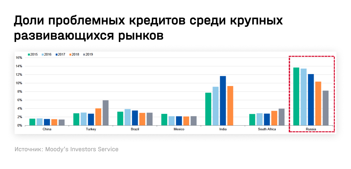 По доле «плохих» займов даже на уровне 2019 года Россия лидирует среди крупных развивающихся рынков, обгоняя Турцию, Бразилию, Мексику, ЮАР и Китай.