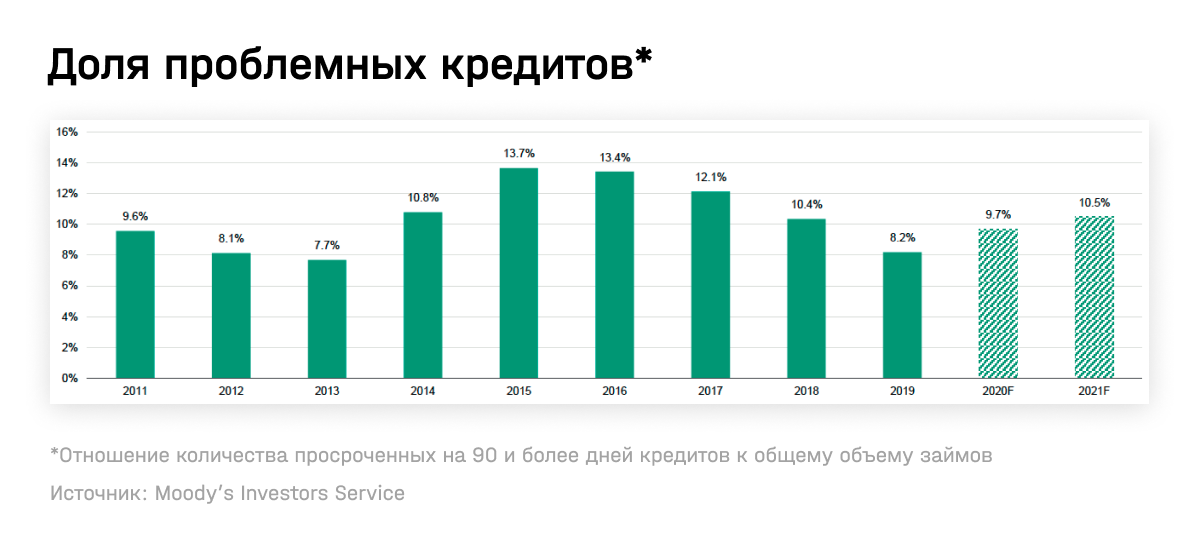 При этом качество кредитов существенно ухудшится. Впервые с 2015 года доля проблемных займов будет снова расти, указал Moody’s. Аналитики прогнозируют, что к 2020 году доля проблемных займов вырастет до 9,7%, а к 2021-му — до 10,5% от общего объема (на конец 2019 года — 8,2%).