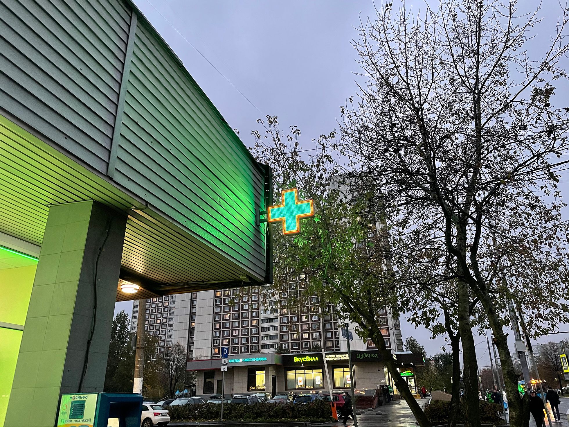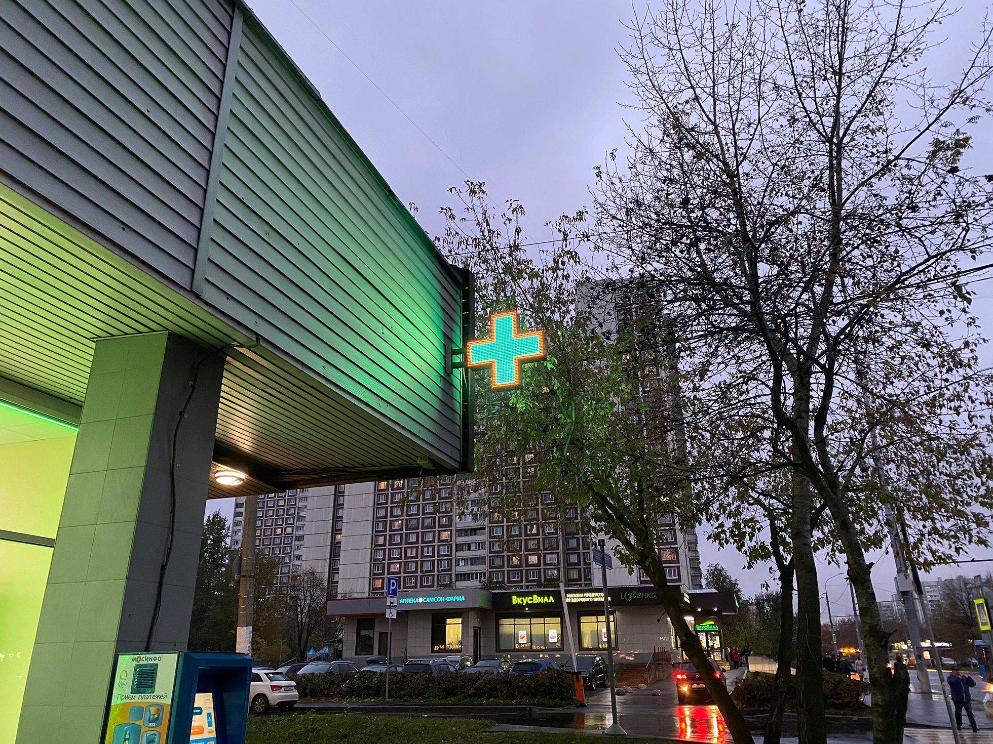 При этом айфоны благодаря все тем же нейросетям и возможностям нового процессора A14 Bionic научились анализировать и зонировать снимки. То есть устройства четко понимают, что присутствует на фото. Особенно хорошо это работает с несколькими источниками света. Огоньки не сливаются в одно размазанное пятно, каждый из них — это отдельный источник света, который учитывают нейросети. Можно сравнить фотографии сияющего аптечного креста, сделанные на 11 Pro Max и 12 Pro.