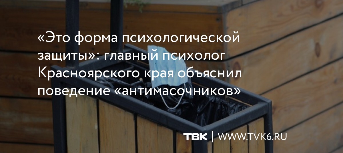 Противники «масочного режима» считают, что средства защиты никак не спасут от коронавируса и приравнивают их к покушению на права и свободы. Главный психолог Красноярского края объяснил, что такое поведение можно назвать протестным, а связано оно с отрицанием очевидной угрозы.