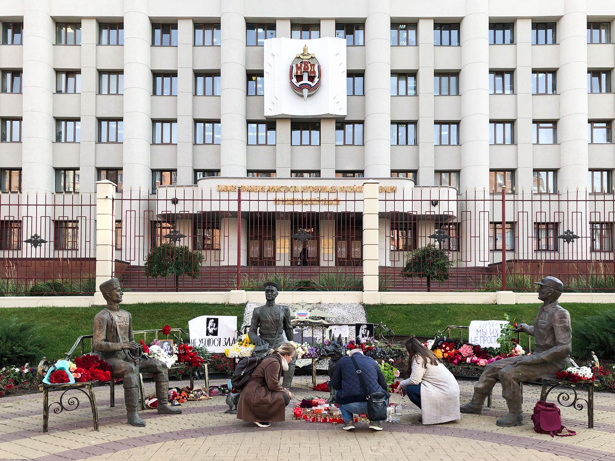 There is a makeshift memorial at the spot where Irian Slavina died. Since that day, people have started bringing flowers, candles, and signs (“Ira, we won’t forgive them!” “I won’t fear evil!”). “It was a completely conscious, deliberate, and clearly regulated act. She just couldn’t resist in another way and overcome what was going on around her. This is a feat — an act that few can manage,” Irina’s friend German Knyazev says through tears. “How much this was justified depends on us. She took the first step. Ours should be simple: make this place an eternal flame of candles, which burns constantly, year-round. We’ll make it happen.”