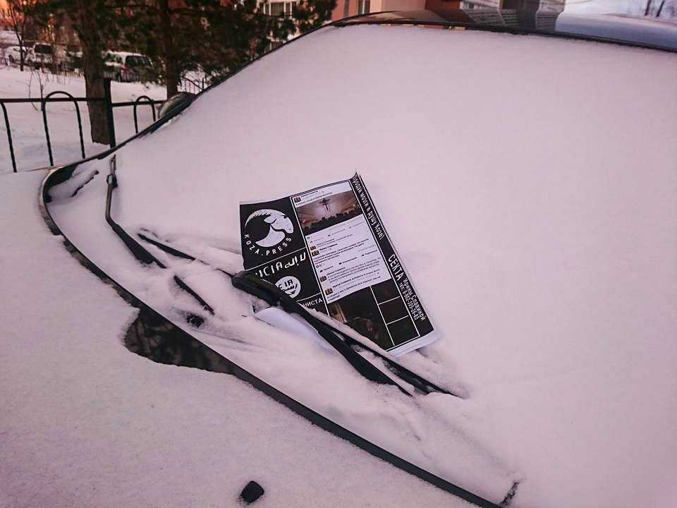 The morning of January 13, 2017, Irina Slavina discovered that someone had slashed her tires and left a leaflet on her car calling her scum. “Today she approves terrorist actions! WHAT CAN WE EXPECT FROM HER TOMORROW?!” The same leaflets, Slavina wrote, “littered the whole neighborhood.”