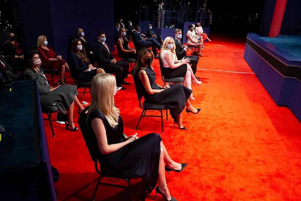 Выборы-2020 большинство здешних обозревателей называют «референдумом о доверии Трампу», подчеркивая, что альтернативная фигура не столь важна. Прежде всего американцы голосуют, оставлять ли в Белом доме Трампа. Президент, недавно переболевший коронавирусом, появился на сцене снова без маски. Первая леди — Меланья Трамп, также перенесшая вирус, была в маске, как и чета Байденов. Вице-президент снял маску только на время дебатов.
