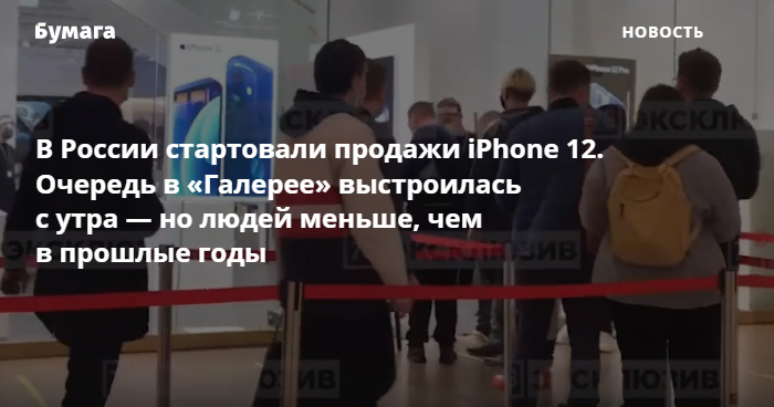В России стартовали продажи новых iPhone 12 и iPhone 12 Pro. В «Галерее» перед магазином re:Store с самого утра образовалась очередь из покупателей.