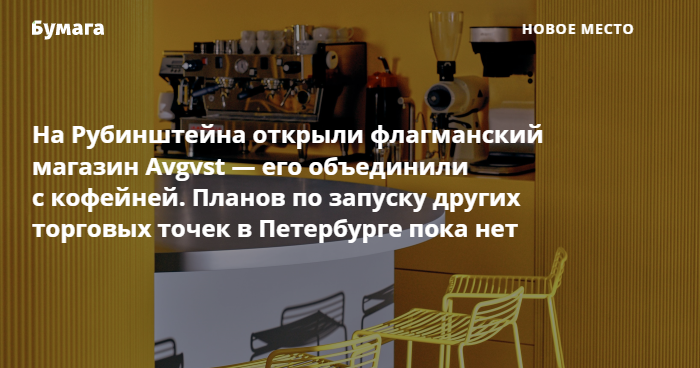 Планов по открытию новых петербургских магазинов у Avgvst пока нет, сообщили «Бумаге» представители марки. Бренд сосредоточится на развитии существующих магазинов (они работают также в Москве и Екатеринбурге).
