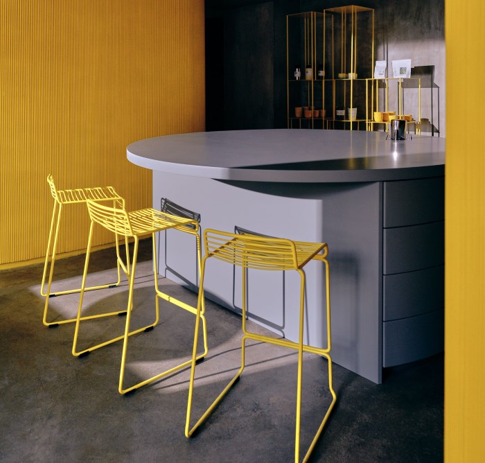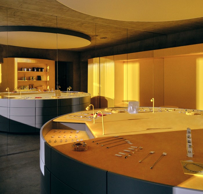 Архитектором магазина стал Гарри Нуриев, основатель Crosby Studios. Концепцию пространства он разработал, вдохновляясь объектами эпохи модернизма: капеллой Notre Dame du Haut авторства Ле Корбюзье и изгибами вазы Алвара Аалто. Магазин, зону ресепшена-бара и небольшую кофейню объединяет декоративная стена-волна из 10 000 деревянных стержней.