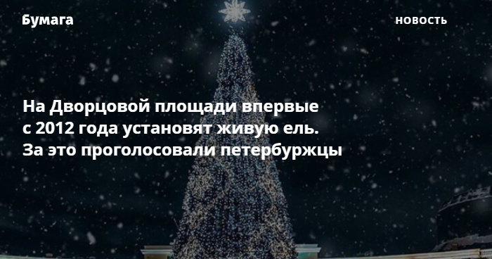 На Дворцовой площади в канун Нового года установят живую ель вместо искусственной. Такое решение принято по итогам голосования, сообщает комитет по печати.