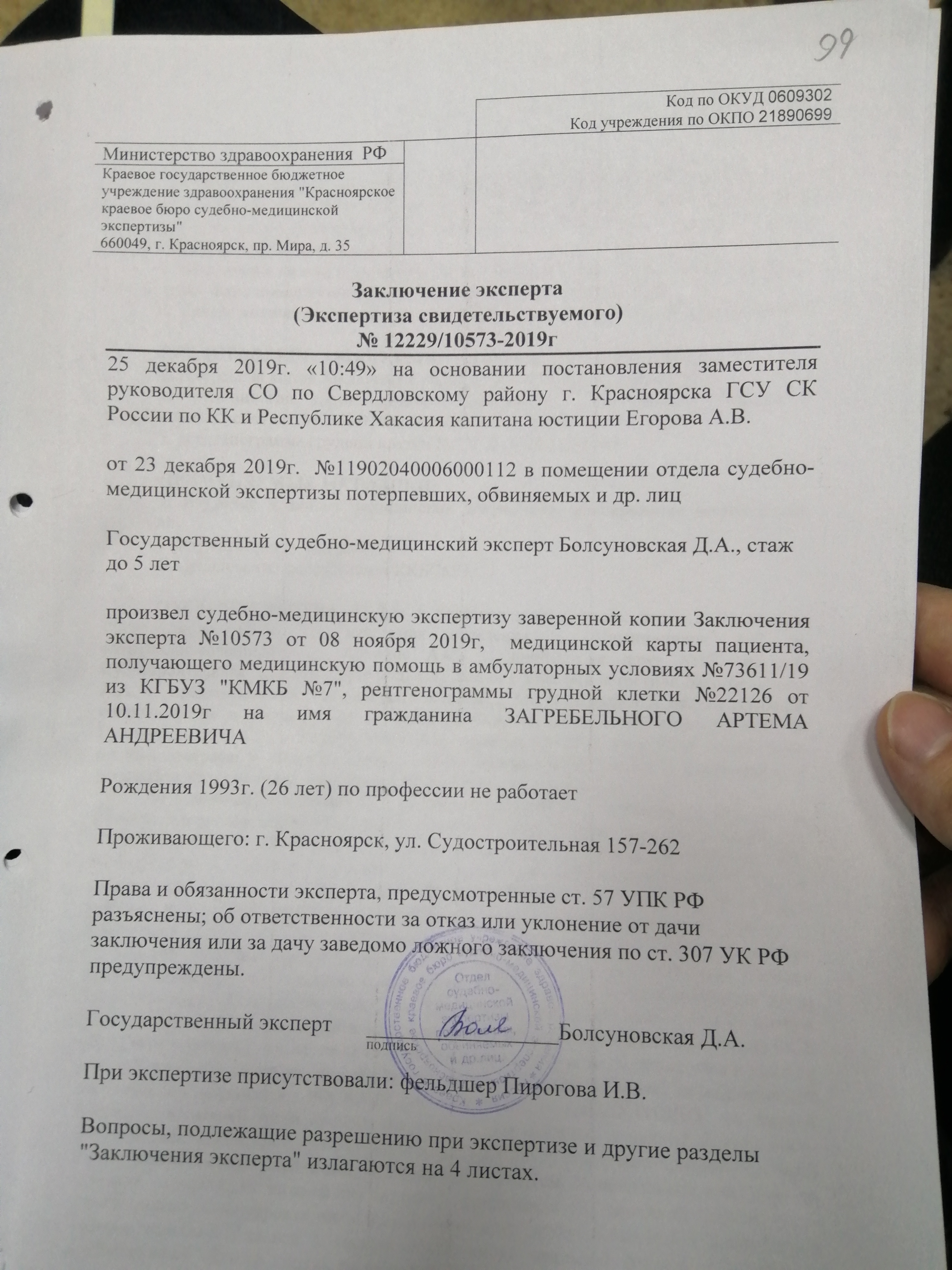 Через несколько дней после задержания медики, к которым обратился Артем, диагностировали у него ушибы грудной клетки с обеих сторон, ягодицы, бедра, подбородка и мягких тканей левого запястного сустава. Спустя месяц судебно-медицинская экспертиза изучила рентгеновский снимок Загребельного от 10 ноября и диагностировала еще и перелом шестого ребра.