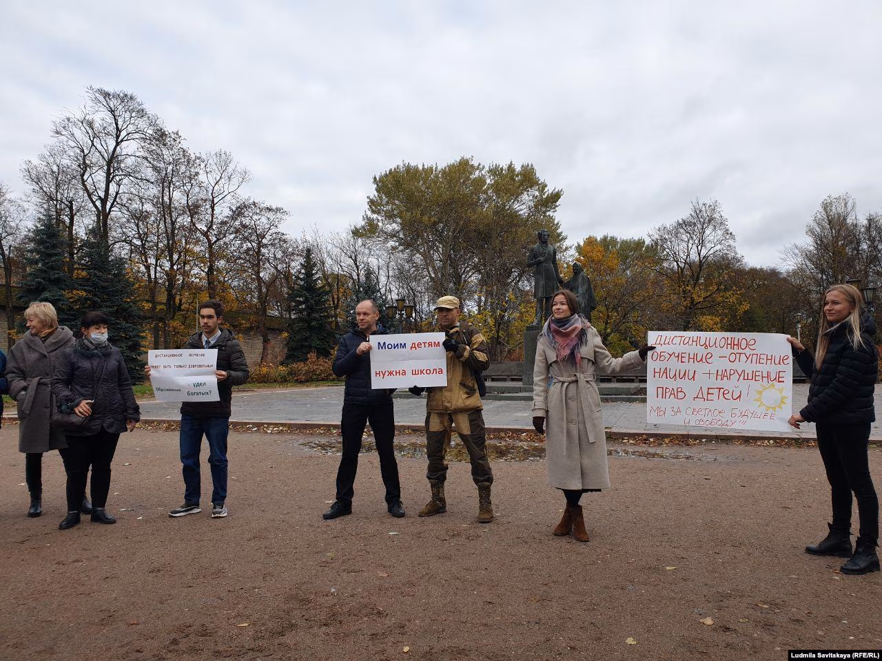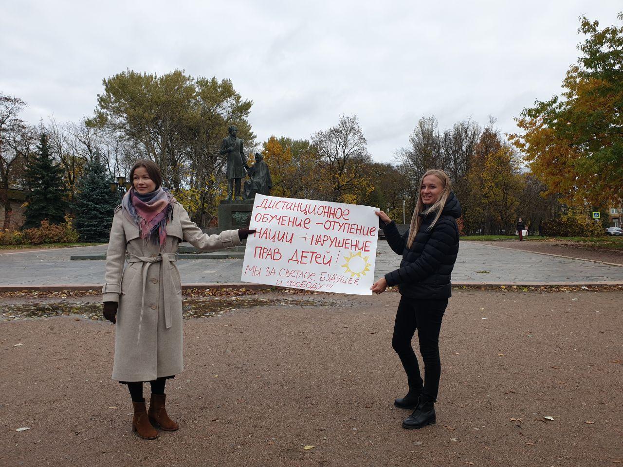 В центре Пскова у памятника "Пушкин и крестьянка" 24 октября состоялся пикет против дистанционного образования. Около 30 человек стояли с плакатами "Моим детям нужна школа" и "Дистанционное обучение - отупение нации", передает корреспондент Север.Реалии.