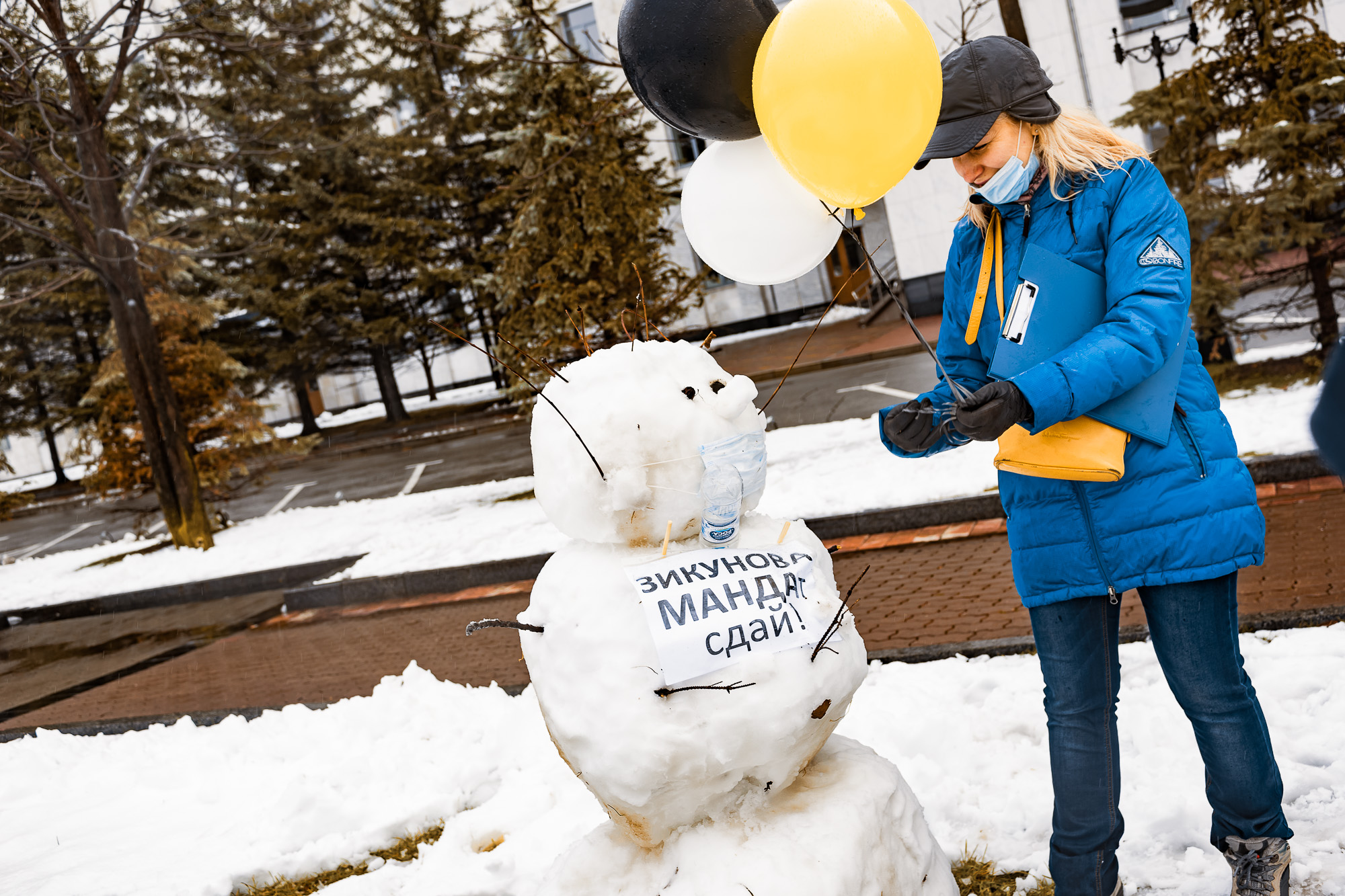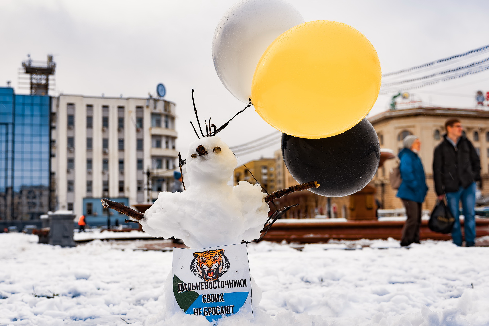 В это время на площади начинают лепить снеговиков – зимних "протестующих". Сначала появляется один – с наклейкой "наш Хабаровский край", затем другой с требованием к председателю краевой законодательной думы Ирине Зикуновой сдать мандат. "Интересно, снеговиков задержат, оштрафуют?" – смеются в толпе.