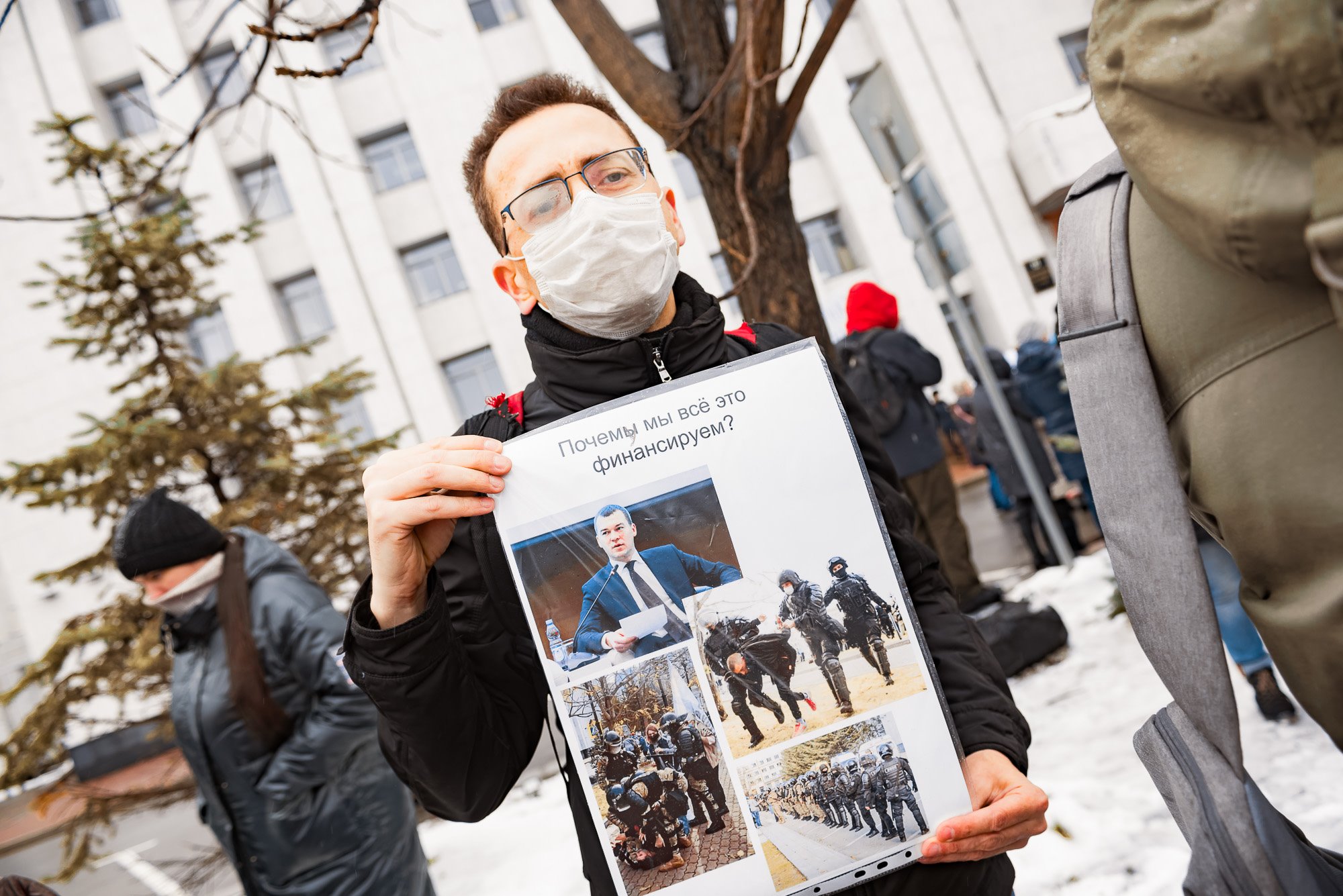 – Минфин планировал сократить, ага. Да он пошутил! Они же просто как одна из голов правительства, – считает участник сегодняшней акции Максим. В его руках плакат с фотографиями жесткого разгона протестующих хабаровским ОМОНом 10 октября и вопрос "Почему мы это финансируем?". – Расходы на силовиков невероятны, и но это не значит, что кто-то позволит их сокращать.