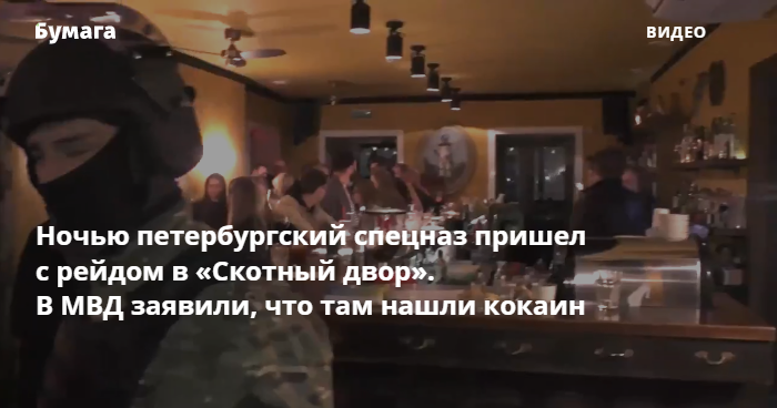 Судя по предоставленному «Бумаге» видео обыска, полицейские пришли в клуб «Скотный двор». По данным МВД, там находилось около 50 человек, восемь из которых отправили на медосвидетельствование из-за подозрения в употреблении наркотиков. Один человек отказался от освидетельствования, из-за чего его привлекли к административной ответственности, отмечает полиция.
