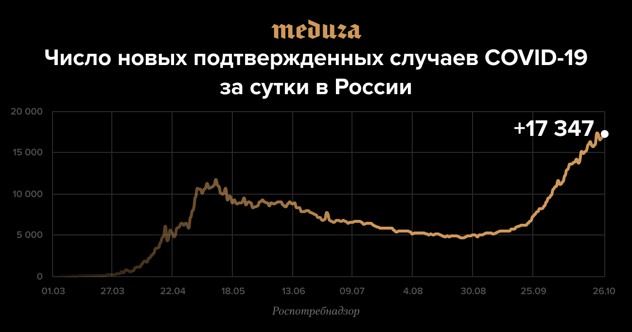 По состоянию на 26 октября в России зарегистрированы 17 347 новых случаев заражения коронавирусной инфекцией, сообщает оперативный штаб по борьбе с вирусом.