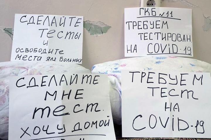 «Сделайте тесты и освободите места для больных» и «ГКБ №11. Требуем тестирования на COVID-19», говорилось на плакатах.