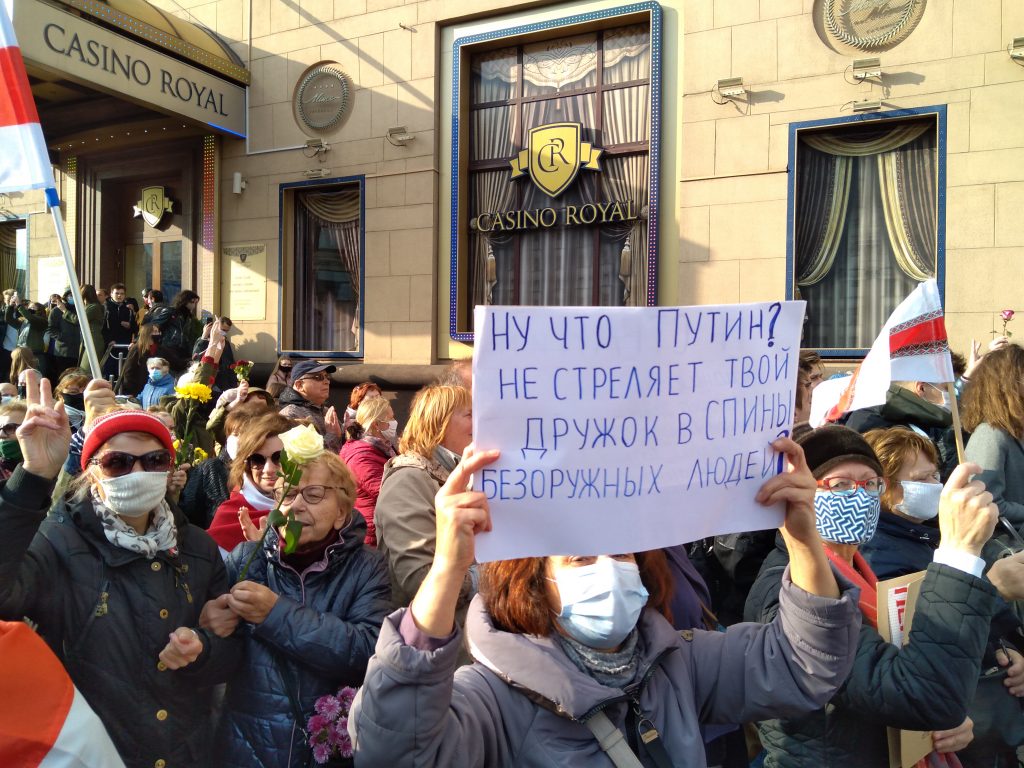 Одна из пожилых женщин несет плакатик с надписью: «Ну что, Путин? Не стреляет твой дружок в спину безоружных людей?» Имеется в виду недавнее заявление президента РФ и последовавший вскоре силовой разгон мирного шествия, когда в людей стреляли резиновыми пулями и кидали светошумовыми гранатами.