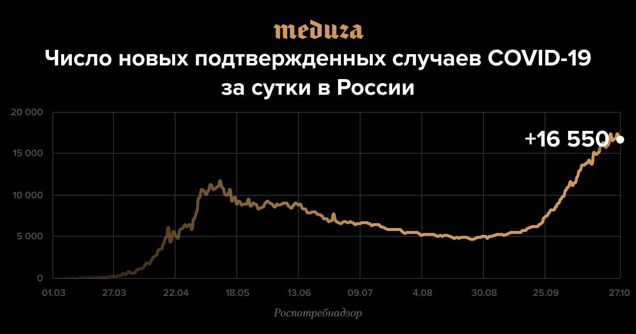 За минувшие сутки в России зарегистрированы 16 550 новых случаев заражения коронавирусной инфекцией, сообщает утром 27 октября оперативный штаб по борьбе с вирусом. Это на 797 человек меньше, чем день назад, когда были зафиксированы рекордные 17 347 новых случаев COVID-19 за сутки.
