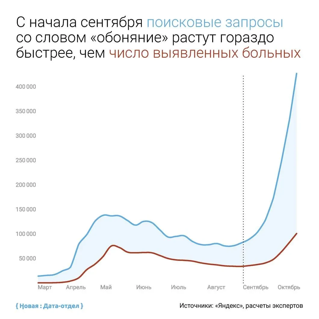 В октябре динамика поисковых запросов, которые касаются пропажи обоняния, показала взрывной рост. При этом до сентября число запросов соответствовало количеству выявленных больных — соотношение между ними было постоянным. С началом нового роста заболеваемости осенью это соотношение нарушилось.