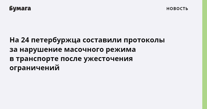 За последние дни чиновники составили 24 протокола об административных правонарушениях в отношении петербуржцев, не соблюдавших масочный режим в общественном транспорте. Об этом пишет «Фонтанка» со ссылкой на комитет по транспорту.