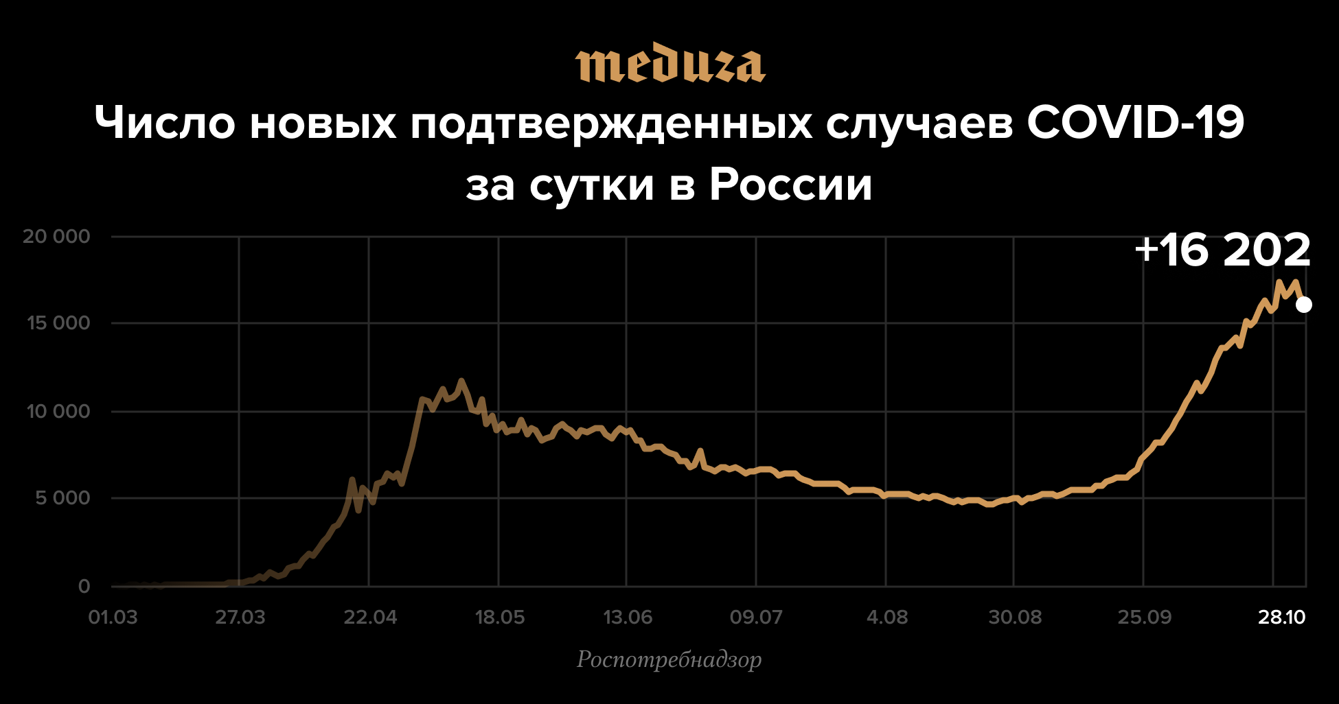 В Москве режим удаленной работы продлили до 29 ноября, а дистанционного обучения для старшеклассников — до 8 ноября. В Томской области продлили каникулы до 8 ноября. В ресторанах Ярославской области запретят проводить массовые мероприятия с более чем 10 участниками. В Калининградской области рестораны не будут работать по ночам. Владимир Путин поручил выделить регионам 10 миллиардов рублей на средства защиты и тесты.