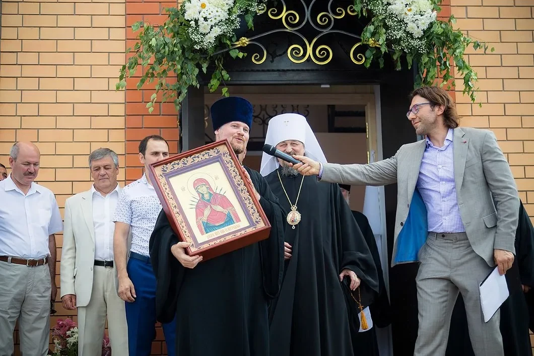 Павел Тапашиди (третий слева), митрополит Иоанн (второй справа) и Андрей Малахов на церемонии открытия храма в поселке Дубовое. Фото: vk.com/belrn