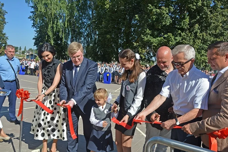 Захар Прилепин (третий справа) и Евгений Савченко (второй справа) на открытии краснояружского образовательного комплекса «Слобожанщина». Сентябрь, 2020. Фото: Гульнара Исмайлова / «Наша жизнь»