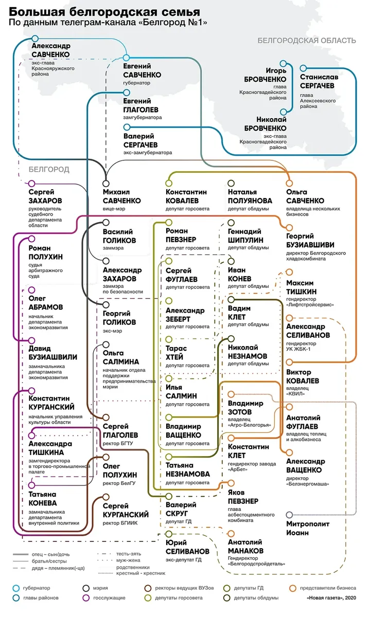 К 2020 году стремление Савченко окружить себя не только дружескими, но и родственными связями (так сложнее выйти из схемы) приобрело относительно законченный вид. На исходе лета телеграм-канал «Белгород №1», ставший главным альтернативным СМИ города, опубликовал огромную инфографику под названием «Большая белгородская семья» («Новая» публикует ее с разрешения коллег в своем виде). На ней отражено, кому и кем приходятся люди в белгородской власти. Масштаб слияния власти, бизнеса и даже образования поразителен: к примеру, сыновья ректоров трех государственных вузов занимают должности в диапазоне от судьи арбитражного суда до зама губернатора.